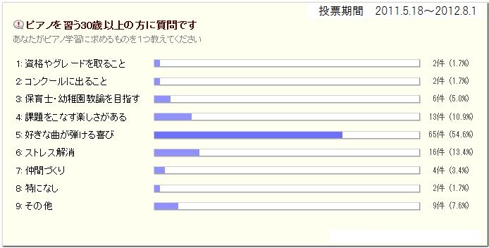 調査は、教室開設3周年記念のイベントとして、生徒の声を聞き、今後の教室運営に役立てることを目的として、2011年秋に知人の大人のピアノ教室で実施された。調査の対象は、1年以上ピアノ学習を継続している成人のピアノ学習者10人である。彼女らは、20歳までにピアノ学習経験をもつ者が8名、ない者が2名で、ピアノ学習経験者8名のうち3名は成人後にピアノ学習経験をもっていた。調査の方法は、各生徒のレッスン時間を利用し、指導者が質問項目を読み上げ、生徒がそれに答える構造化インタビュー調査法であった。