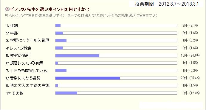 | 先生自身も向上のために努力していないと・・某音楽教室の発表会とか見に行くと酷かったりするので。 | 20代 | 女性 |