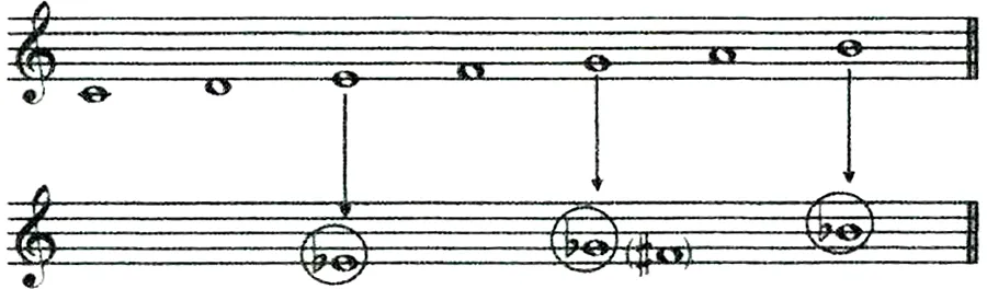 特徴1として、ブルース独特の哀愁や魂の叫びのような感情を、一般的に遅めのテンポで率直に表現します。そのため以下のような手法も使いますが、特徴2の「ブルーノート」とは、メジャー・スケール(長音階)の第3・5・7音が半音下がったものを指します(譜例1)。これらの音は、メジャー・キー(長調)でありながら哀切を感じさせ、このメジャーかマイナーか分からない、どっちつかずのニュアンスが、ブルースの切ないフィーリングにつながります。