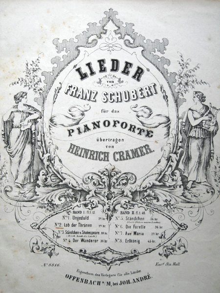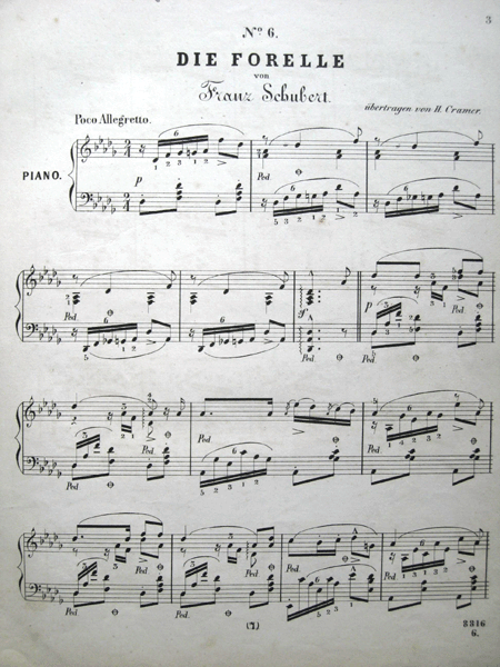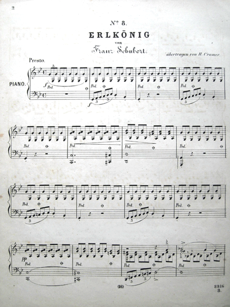タイトルページその中から最初はクラーマー(Heinrich Cramer 1809年スツットガルト生~1877年フランクフルト没)編曲の楽譜のタイトルページと「魔王」、「ます」をお見せします。シューベルトの歌曲のピアノ・トランシクリプションと言えばまず大抵の人が有名なリスト編曲を思い浮かべると思います。このコーナーの第1回でも「魔王」のリスト編の初版譜を紹介しました。しかしそれ以外にもトランスクリプションはたくさん存在します。今年のラ・フォルジュルネでもカール・チェルニー編曲によるものが演奏されるので、僕はそれ以外のものとしてクラーマーを選びました。リストのものに比べれば平易なものですが、その分原曲により忠実といえましょう。この楽譜は19世紀後半のものです。タイトルページも中々凝っていますね、味気ない現代の楽譜とはまた一味違った趣があります。2曲ともお馴染みの良く知られた曲なので、リスト編曲のものと比べてみて下さい。