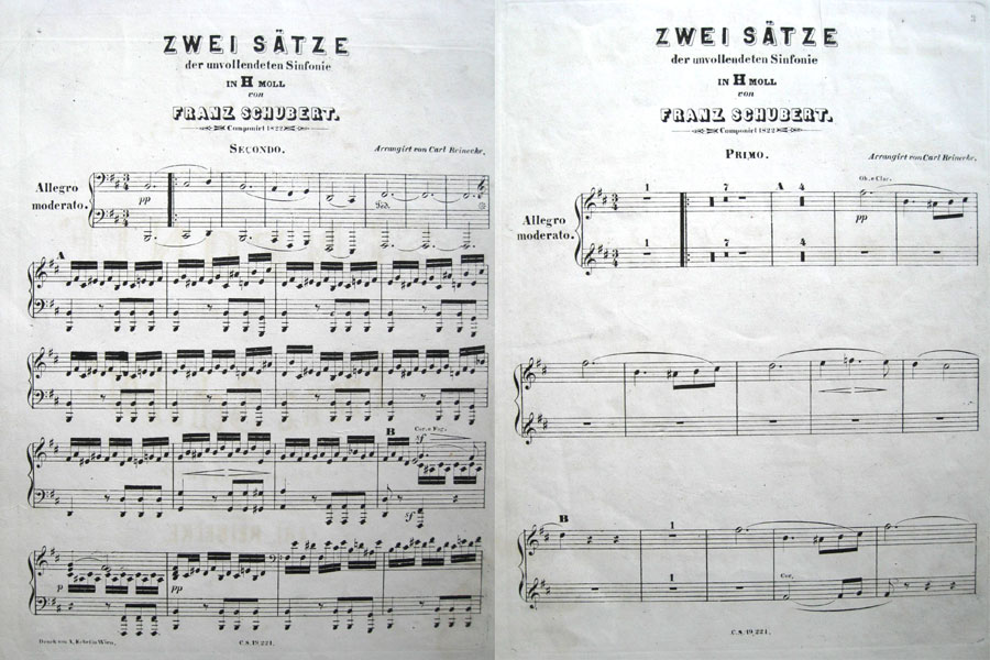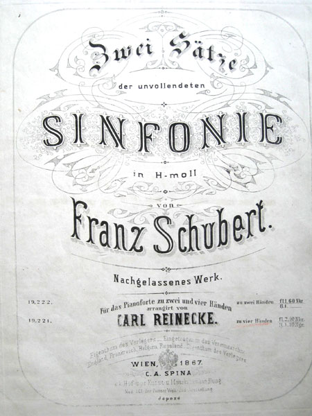 タイトルページ最後は有名な「未完成」のカール・ライネッケによるピアノ・デュオ編曲版です。この楽譜は1867に出版された初版で、タイトルページにも記載されているようにライネッケによるピアノ2手版も存在します。ライネッケはこれ以外のシューベルトの交響曲をピアノ・2手、4手に編曲しています。今回のラ・フォルジュルネでは時間の制約上、第1楽章のみが演奏されますが是非全楽章、といっても未完成ですから2楽章ですが、武久・山川さんのデュオで聴きたいものです。武久さん、山川さんには以前にも僕の初版譜を使用してチャイコフスキーの「悲愴」、メンデルスゾーンの「イタリア」「スコットランド」を作曲者自身のピアノ・デュオ編曲で演奏してもらいましたが、さすがに息のあった迫力のあるものでした。今回の演奏も楽しみです。皆さん是非聴きに下さい。