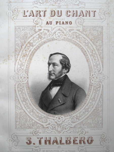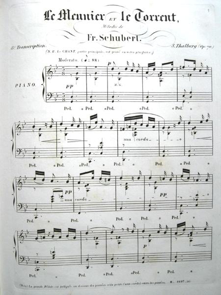 タイトルページ続いてはリスト、ショパンと同じ時代に活躍していたヴィルトゥオーゾ、タールベルク編曲の「水車職人と小川」です。この編曲は「(ピアノで)歌う為の技術」L'ART DU CHANT 作品70という曲集の中の第8曲にあたります。タールベルクのリト刷りのポートレイトがタイトルページを飾る豪華本です。これはフランスで出版されたもので、この曲集には他にもベートーヴェンの「アデライーデ」、モーツァルトのレクイエムより「ラクリモーザ」などが収められています。当時有名だった曲をもとにピアノで滑らかに歌わせることを主眼とした編曲を集めた大変すぐれたものです。ピティナの皆さんにも是非とも演奏してもらいたい曲集です。タールベルクに関しては僕のコレクションに多くの優れた作品があるので、別の機会に紹介しましょう。
