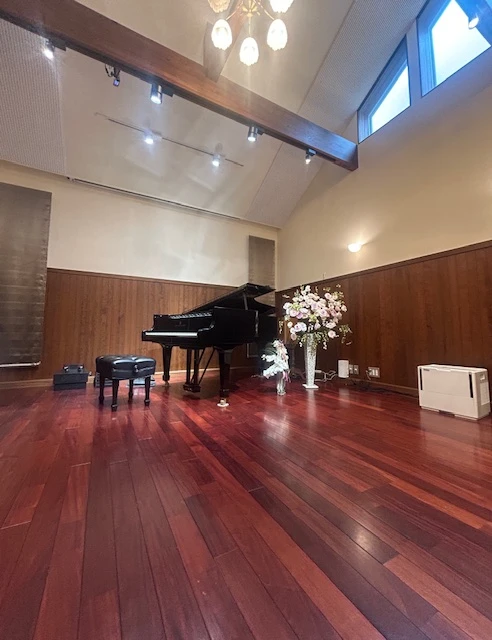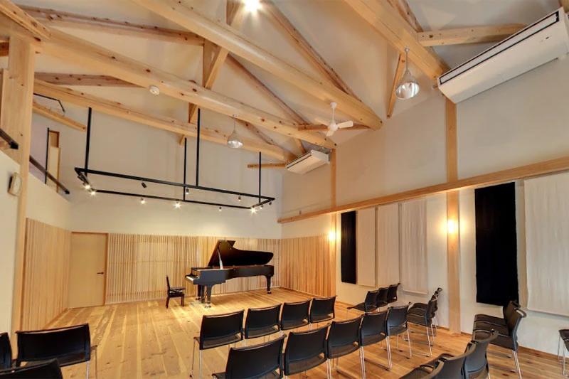 所有していたスタインウェイのフルコンサートピアノを、狭い練習室に埋もれさせるよりは広い空間で皆さんに活用していただきたいと思い、サロンをつくりました。地元・愛知県産の杉の木を使った木造で、最高部の高さは6m以上あります。ピアノや室内楽の個人練習やリハーサルで月の半数以上が貸し出し利用されています。