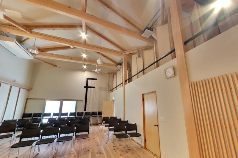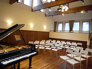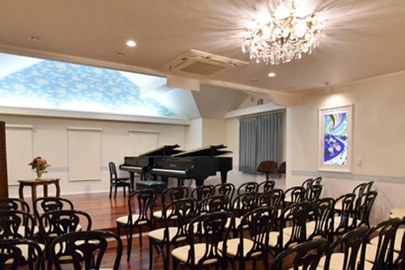 室内楽や歌を学べる、大人の集まれるサロンがあればいいなと思い、自宅医院開業の際に2階に80席のホールを作りました。ステージ側から見ると上方の窓から青空が見え、特に歌い手さんや管弦の奏者から気持ちが良いと喜ばれています。室内楽コンサートや公開レッスン、ステップやコンクールにも活用しています。