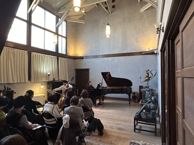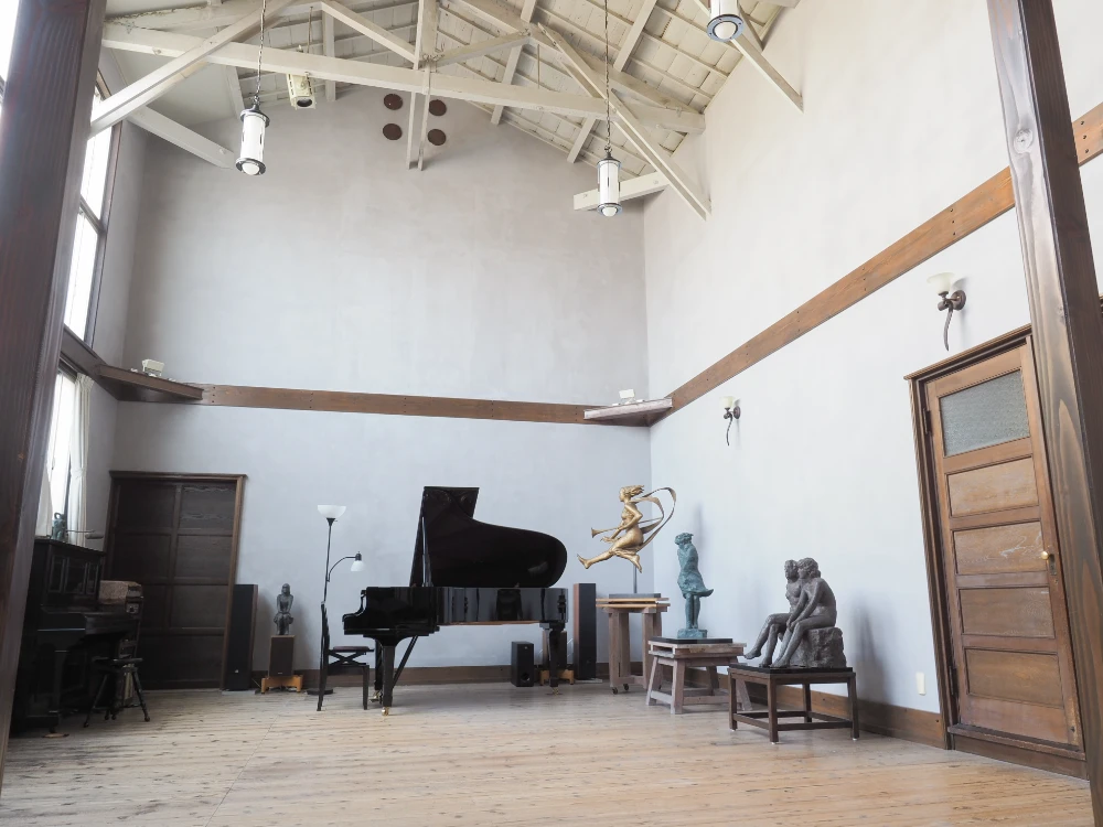 彫刻家であった故祖父・松田尚之が1936年に建てたアトリヱで、2018年、京都市の事業「京都市民が選ぶ京都を彩る建物や庭園」に選ばれました。天井8メートル、漆喰の壁、木造建築のこの空間で奏でるピアノの音色は、まろやかに響き、そして芯があり、色彩やニュアンスの違いをはっきり浮き立たせてくれます。